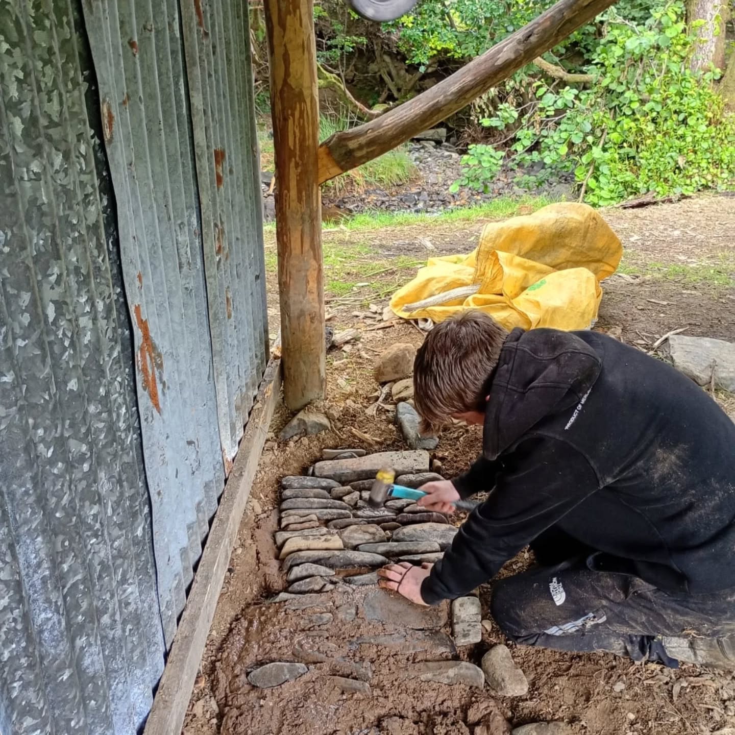 From there, Sian led me through a gate and along a very muddy track beside a stream (thankfully, I’d worn trail running shoes). This was home to the Land group, who were hard at work learning the art of cobbling. Their task for the day was creating a solid floor area for an already impressive den they’d built earlier in the programme.