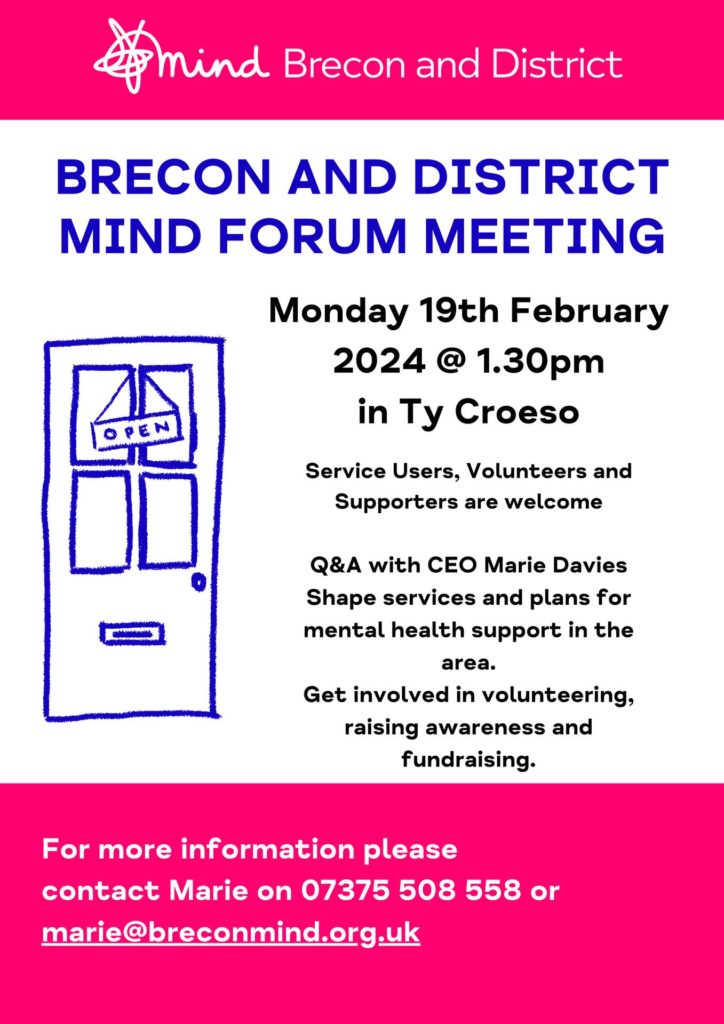 An opportunity to ask the CEO Marie Davies questions and help shape future services at Brecon & District Mind.