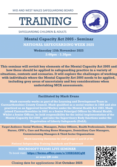 Please find attached details and booking link for the Mental Capacity Act 2005 Seminar, to be facilitated by Mark Evans. This event will take place on Wednesday 12th November 2025 from 2:00pm-3:30pm.