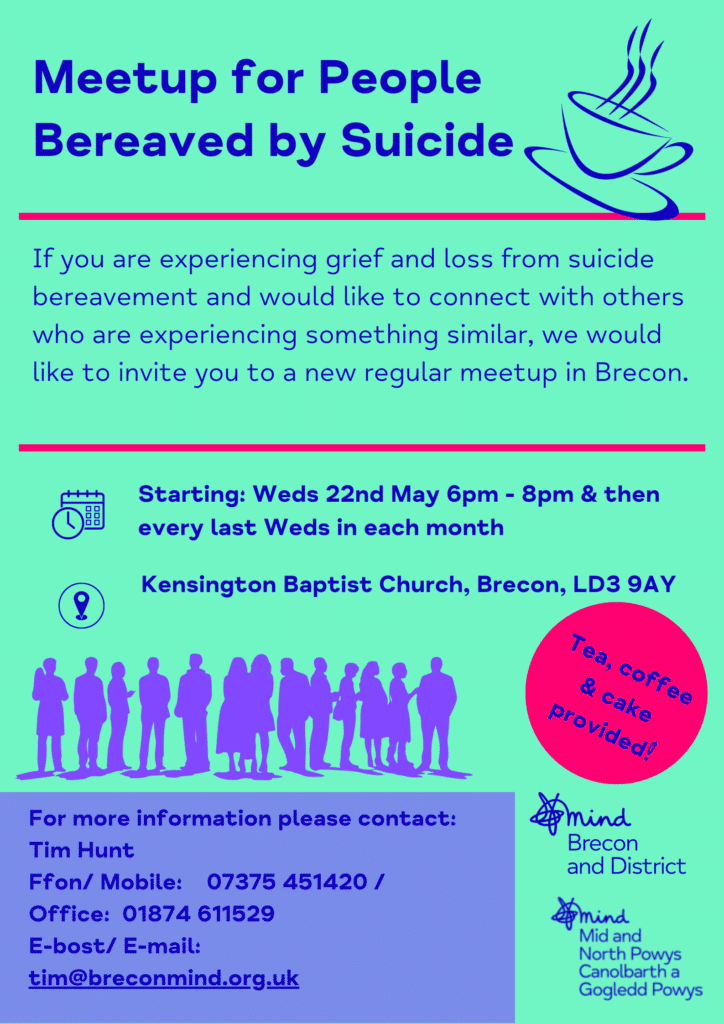 If you are experiencing grief and loss from suicide bereavement and would like to connect with others who are experiencing something similar there are new groups being set up across Powys. These are online, face to face, or walk and talk format, see below for further details and who to contact for further information.