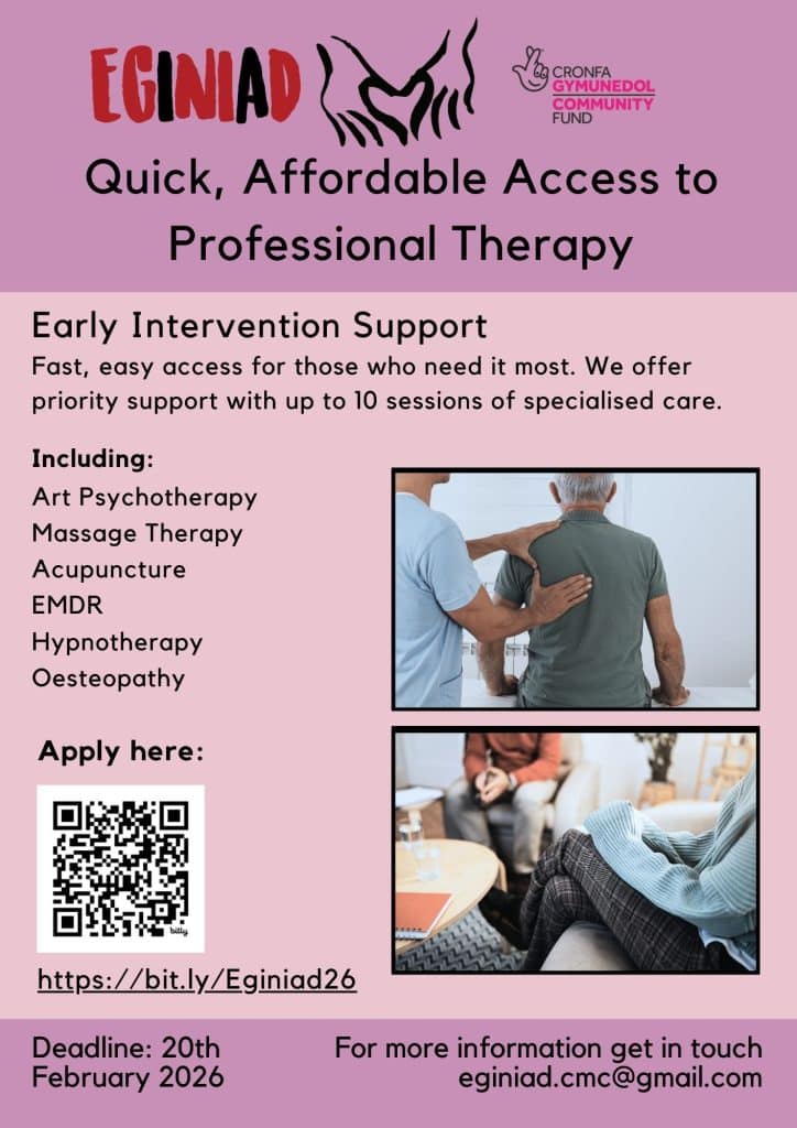 Following our recent announcement that Eginiad’s Lles a Lluniaeth / Nourishing Community Together project has been awarded funding from The National Lottery Community Fund, we’re delighted to share that our Therapeutic Support Programme will open for applications in the new year.