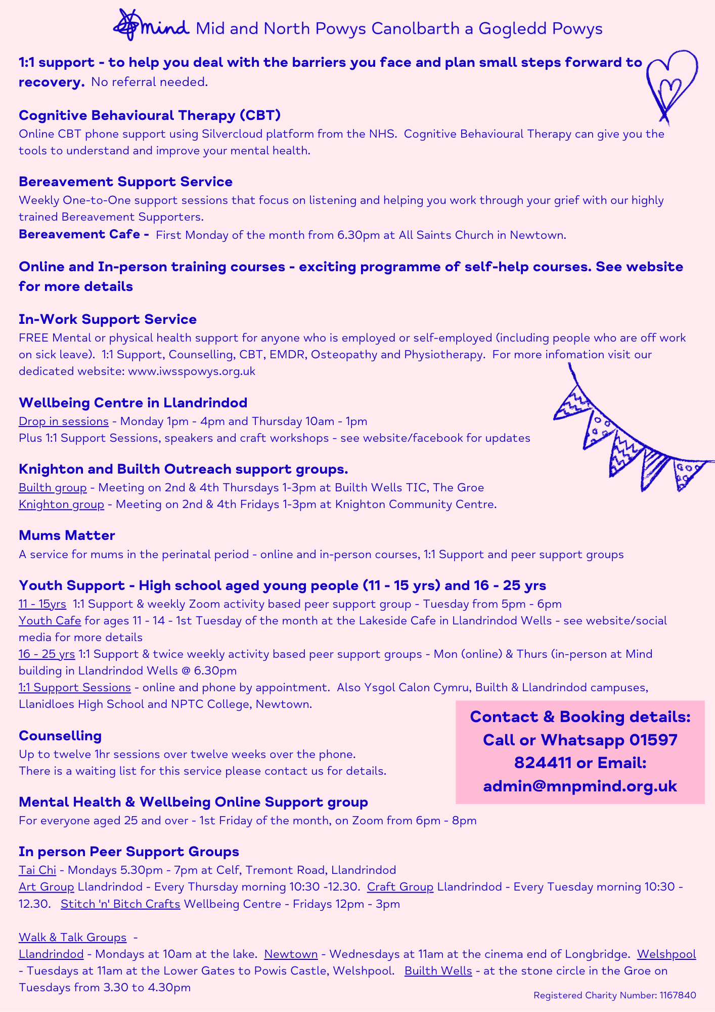Or simply get in touch by calling or texting them on 01597 824411 emailing: admin@mnpmind.org.uk or dropping in to the offices at Arlais Road Monday to Friday from 9am to 6pm.