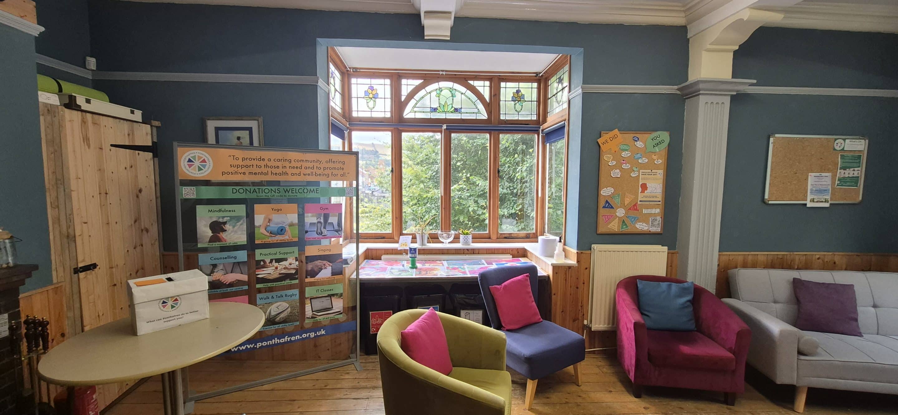 On my tour of the centre, I got real of how lived-in and loved the building is, with it’s stained glass windows, comfy sofa’s, calm counselling rooms, and outdoor seating nooks Ponthafren provides a safe, warm and welcoming environment for all.