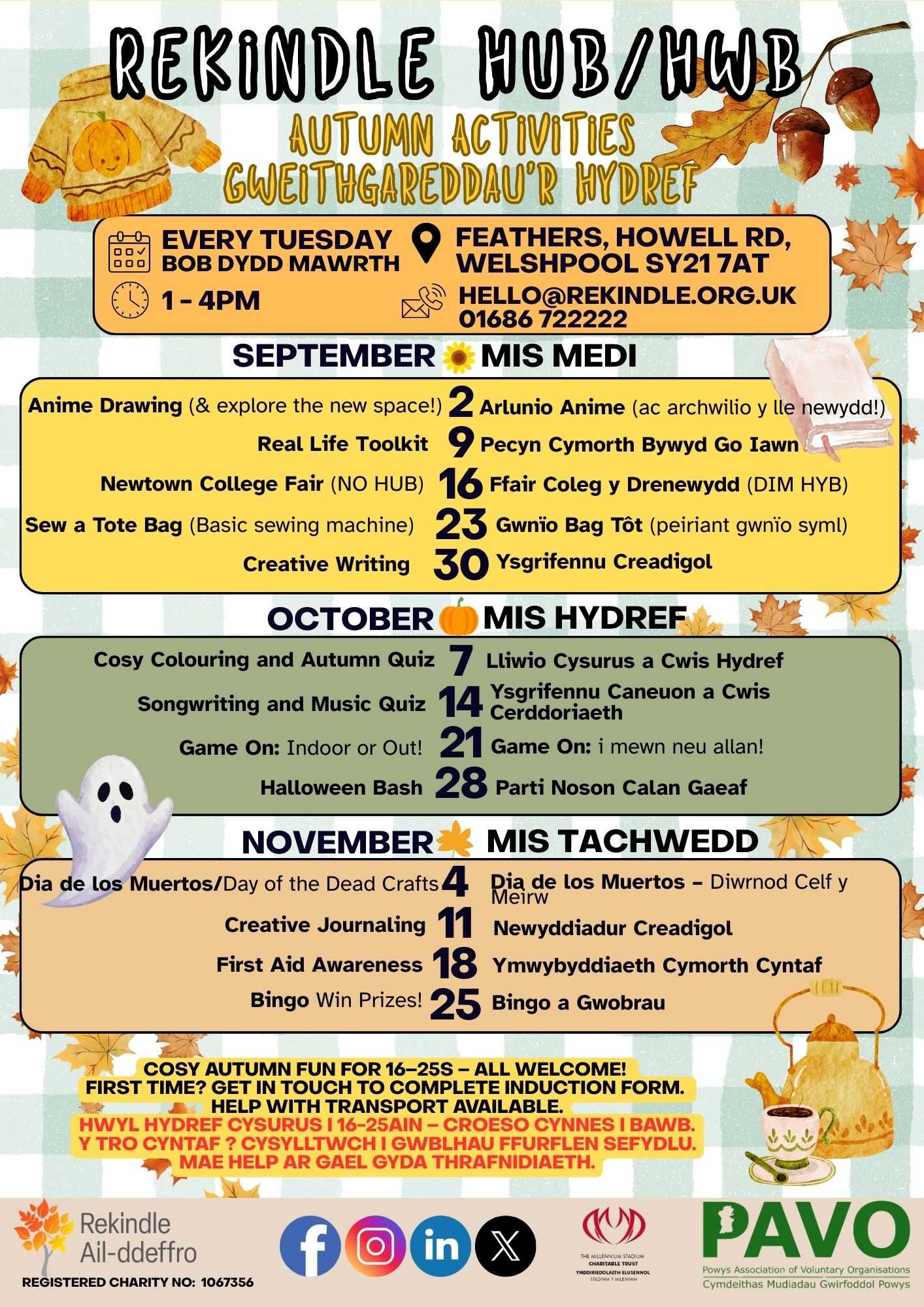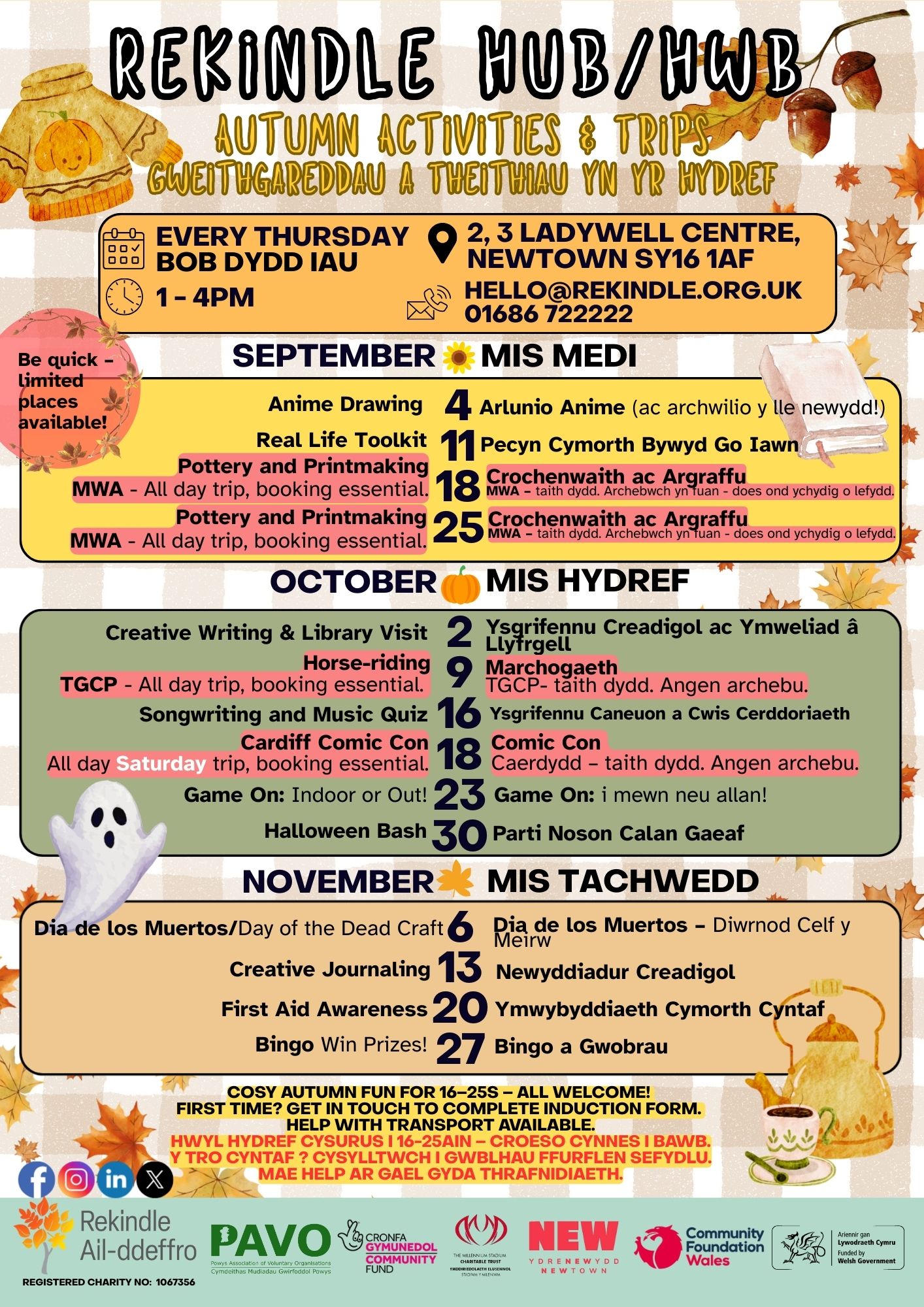 The Drop in Hub in runs on a Thursday in Newtown and at the new Welshpool location on a Tuesday. There is a packed program of events for upcoming months with activities and trips which can be found on Rekindle’s Facebook page or by picking up a leaflet from one of their centres.